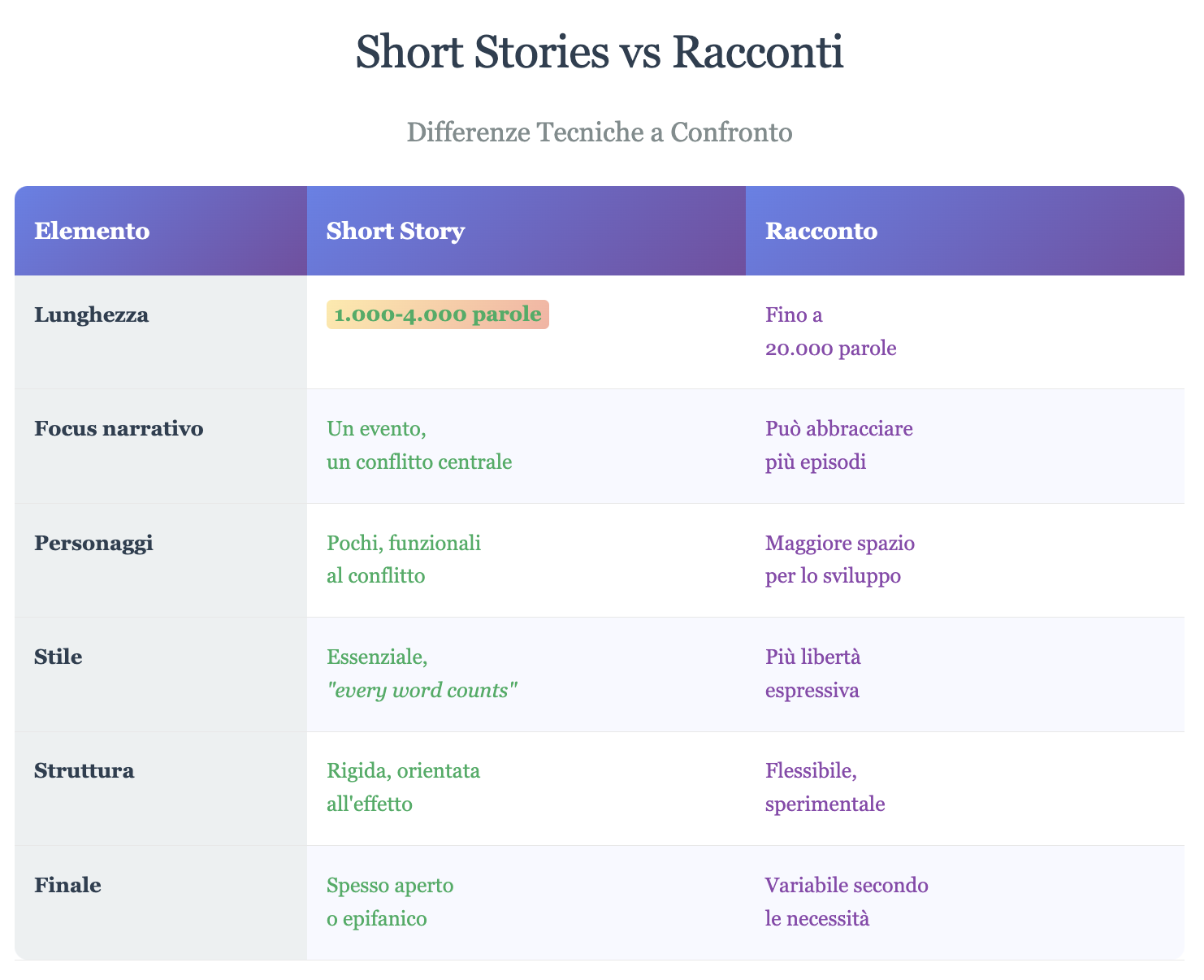 Il racconto, nella nostra tradizione, mantiene la brevità ma si concede più libertà strutturale e stilistica. La lunghezza può variare considerevolmente (da poche pagine a 15.000 - 20.000 parole), e questa flessibilità si riflette anche nell'approccio narrativo.